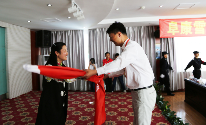 西藏志愿服務(wù)聯(lián)合會(huì)副秘書長為阜康雪域天使志愿者服務(wù)隊(duì)授予隊(duì)旗