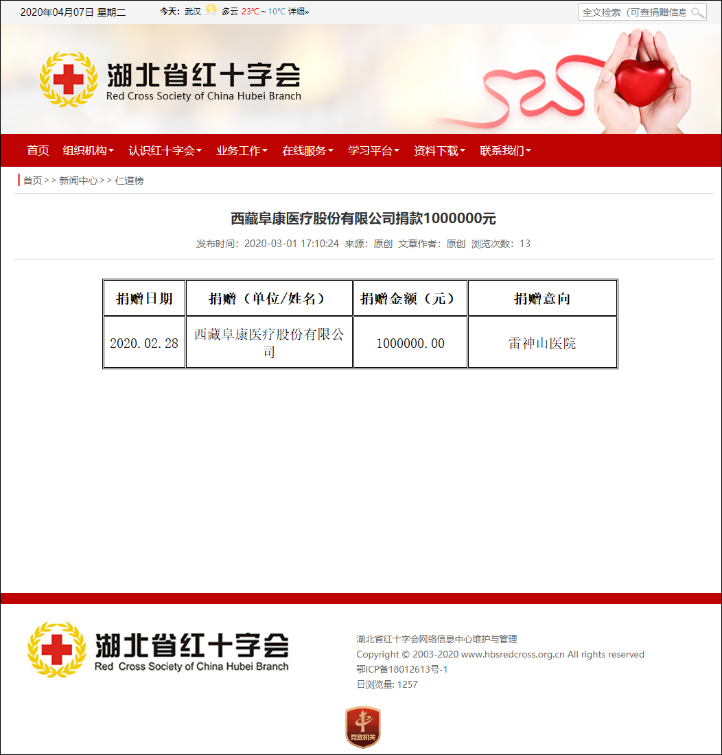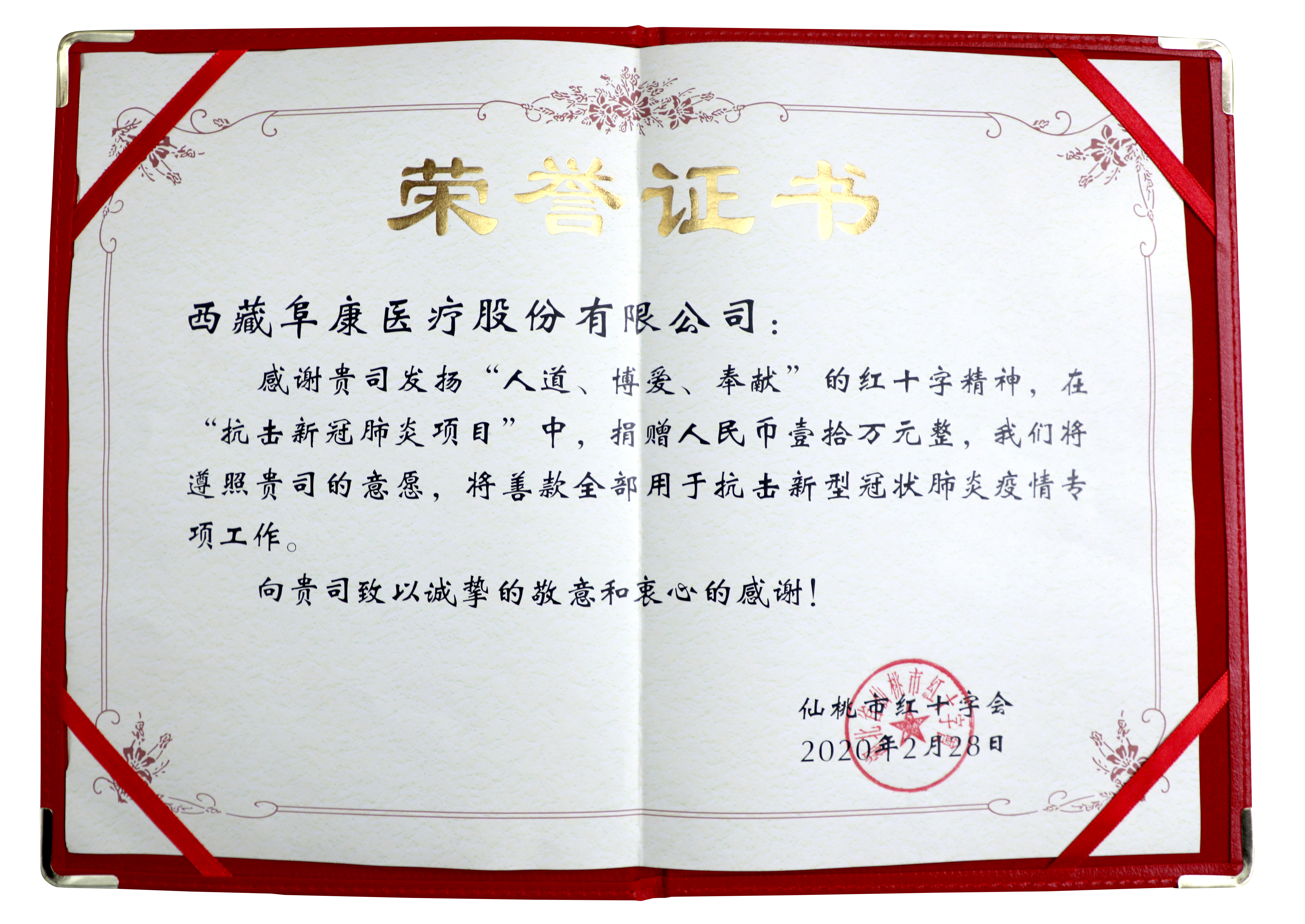 日前,湖北省仙桃市紅十字會向西藏阜康醫(yī)療股份有限公司寄來一份榮譽(yù)證書,感謝西藏阜康醫(yī)療在全市抗擊新冠肺炎行動中發(fā)揚"人道、博愛、奉獻(xiàn)”的精神,積極向仙桃市捐款十萬元支持該市"抗疫”工作。