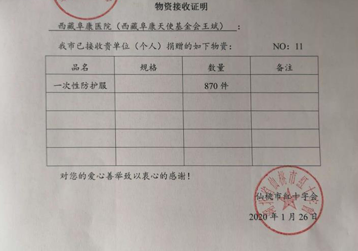 1月26日,在公司黨委書記、董事長王斌先生的指示下,阜康醫(yī)療緊急向湖北仙桃市紅十字會捐贈了價值10萬元的870套防護(hù)服,隨后在2月28日分別向湖北省紅十字會、仙桃市紅十字會捐款100萬元和10萬元,支持湖北省和仙桃市"抗擊新冠肺炎項目”。